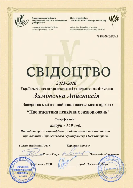 - Пропедевтика психічних захворювань – повний цикл (150 год.)