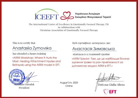 Моя основна спеціалізація — емоційно фокусована психотерапія з урахуванням принципів клієнт-центрованого підходу.